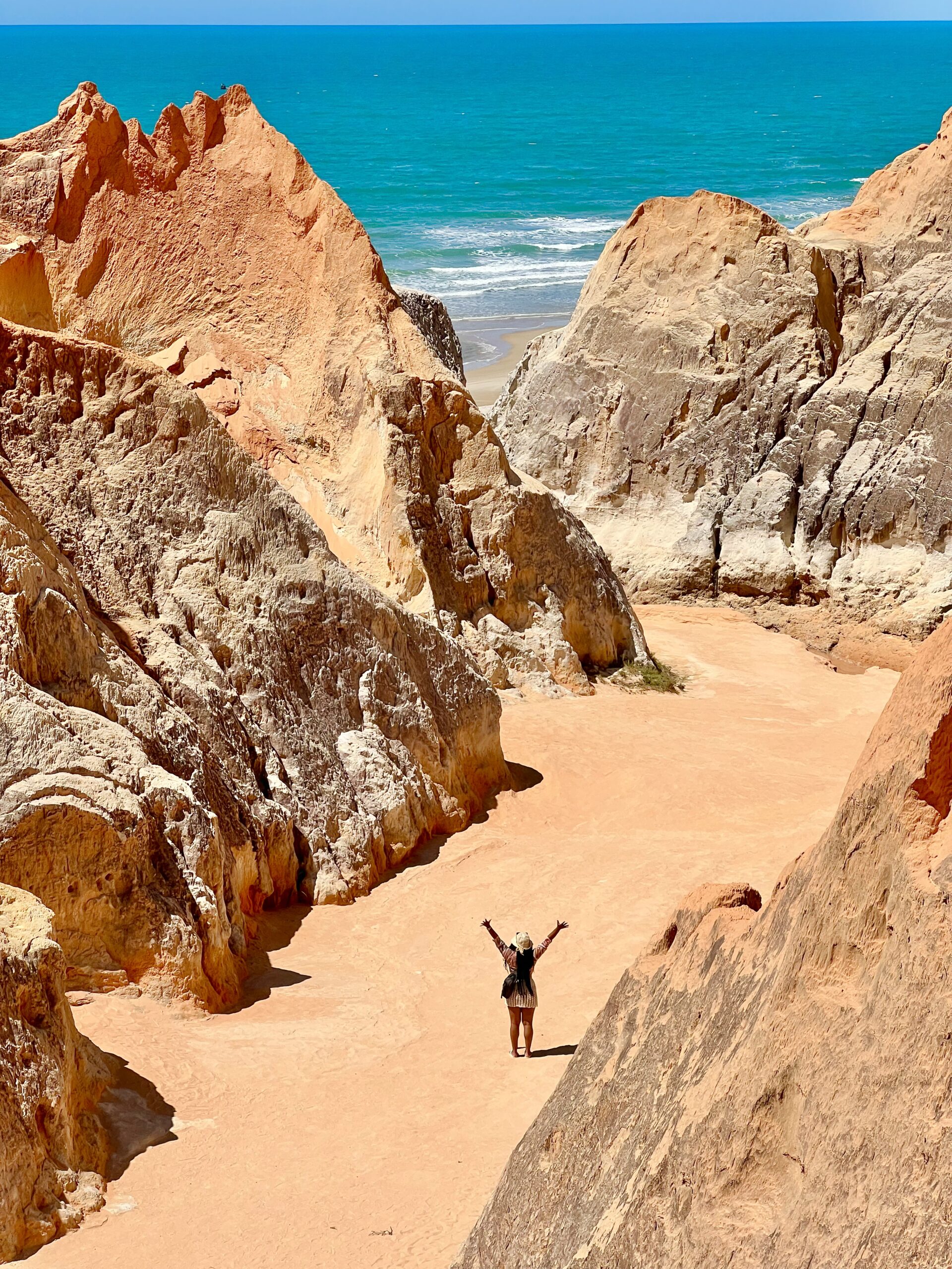 Praia de Morro Branco, conhecida pelas falésias coloridas, pelo labirinto natural de areia e pelo charme do artesanato local